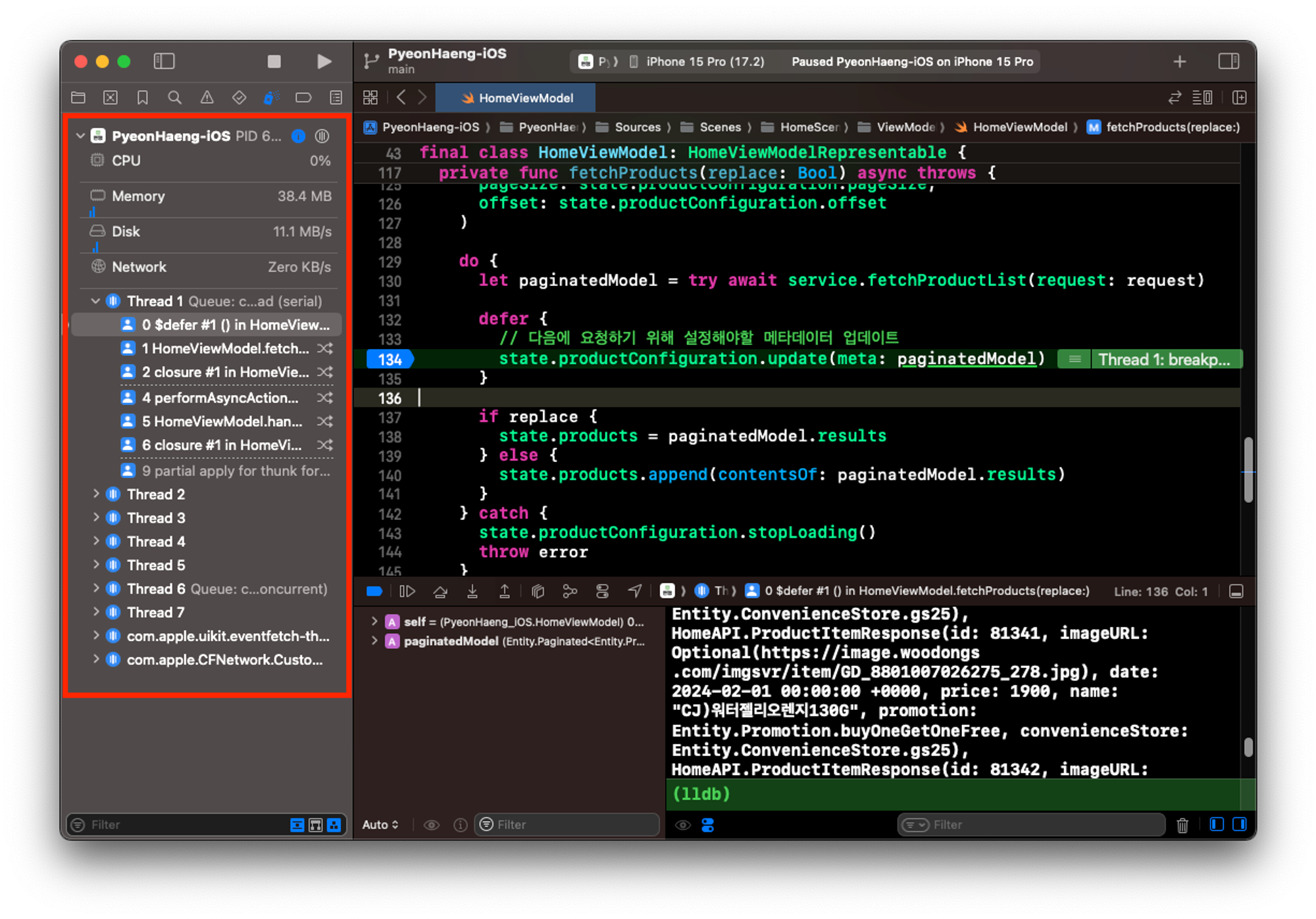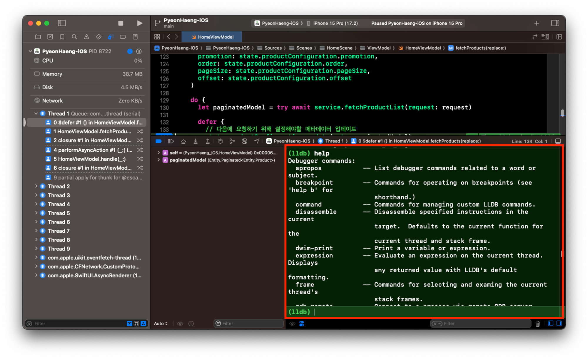 - 가장 쉽게 접할 수 있는 BreakPoint를 찍으면, 앱이 멈추면서 lldb를 실행