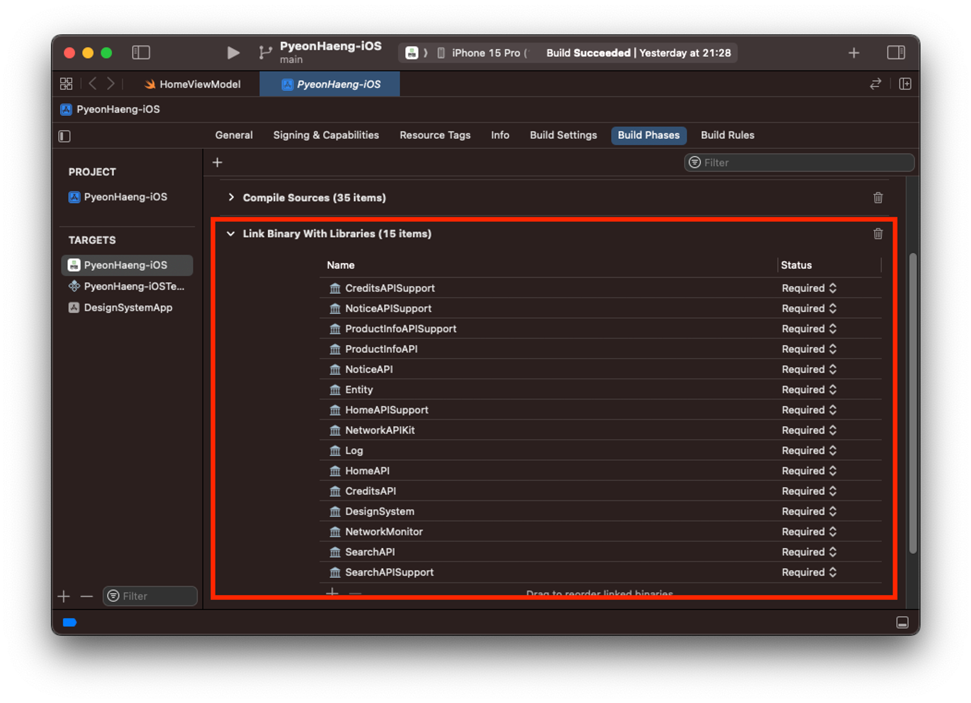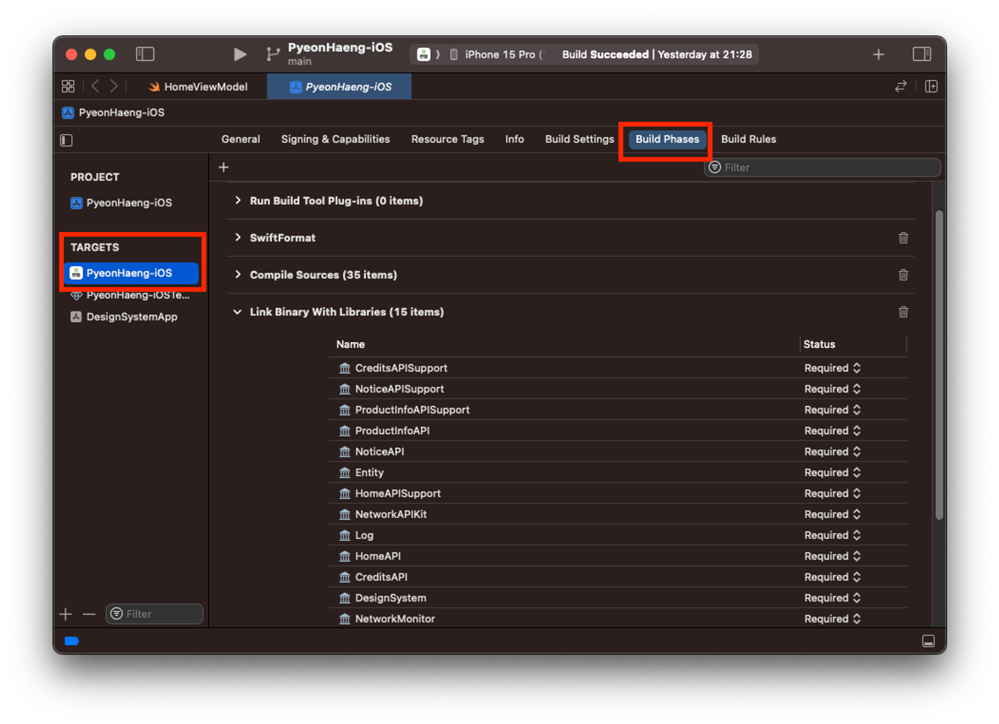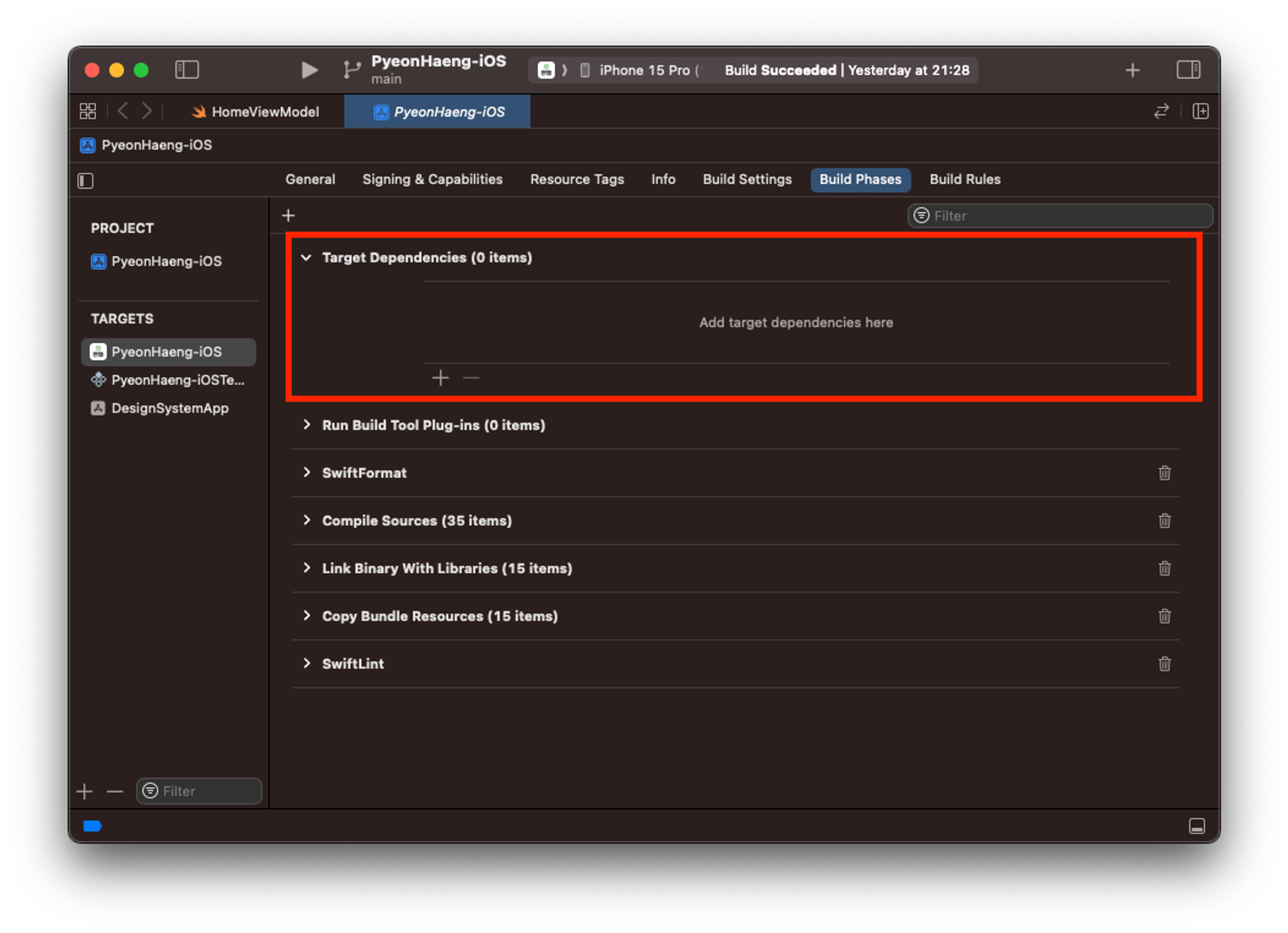 - SPM이나 Pods로 추가된 외부 라이브러리 및 Apple 프레임워크는 Target Dependencies에 명시적으로 추가하지 않아도 됨 → 프레임워크를 추가할 때, 알아서 종속성을 관리해 줌
